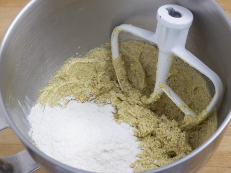 8. Ajouter la farine à vitesse moyenne en deux ou trois additions et bien mélanger avant d'ajouter plus de farine.