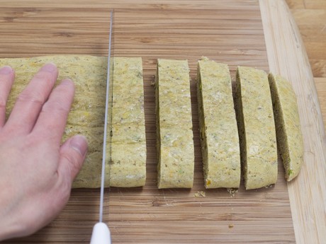 11. Retirer du four et réduire la température à 325℉ (165℃). Laisser tempérer pendant 25 minutes. À l’aide d’un couteau dentelé, couper en biscottis de ¾ pouce (1.9 centimètre) de largeur et remettre sur la plaque en laissant un espace d’un doigt entre chaque.