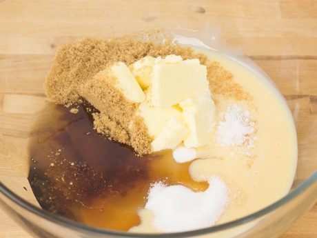Dans un bol moyen allant au four à micro-ondes, combiner tous les ingrédients et bien mélanger (il restera des morceaux de beurre).