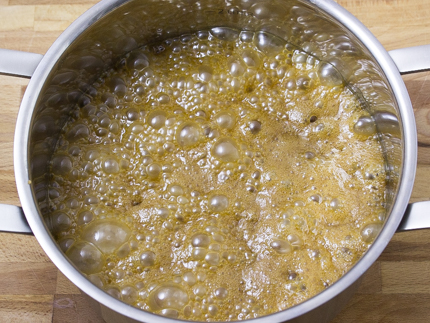 Transférer dans la casserole et faire chauffer à nouveau à feu moyen-doux. Cuire en remuant jusqu’à ce que la préparation épaississe et nappe le dos d’une cuillère, environ 10 à 12 minutes.