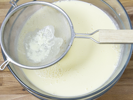 Passer la préparation au tamis dans un bol déposé par-dessus un autre bol rempli de glace. Laisser refroidir jusqu’à température pièce en remuant de temps à autre.