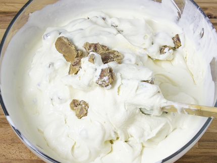 Si vous utilisez une machine à crème glacée, suivre les instructions du manufacturier jusqu’à ce que la crème glacée atteigne la consistance de la crème glacée molle.