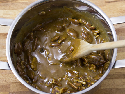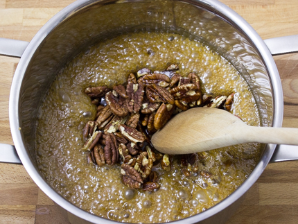 Retirer immédiatement du feu et ajouter les pacanes rôties, le bourbon (facultatif), l’extrait de vanille et le sel.