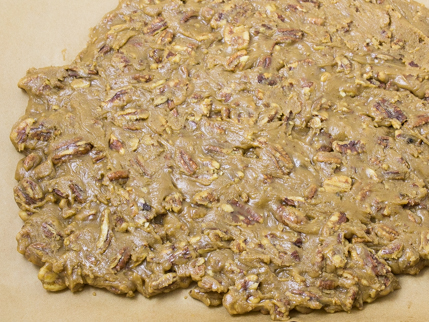 Préchauffer le four à 325°F (165°C). Étendre les pacanes en une seule couche sur une plaque à biscuits et rôtir pendant huit minutes. Laisser tempérer.