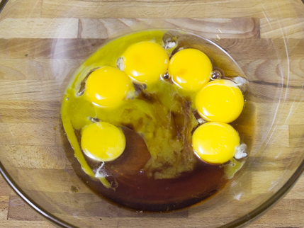 Fouetter dans un grand bol le sirop d’érable, l’extrait de vanille et les jaunes d’oeufs jusqu’à ce que le mélange pâlisse, environ deux minutes. Réserver.