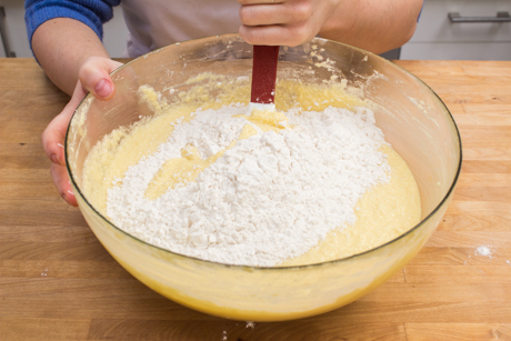 Ajouter les ingrédients secs et mélanger avec une cuillère de bois ou une spatule en caoutchouc. Ne pas trop mélanger.