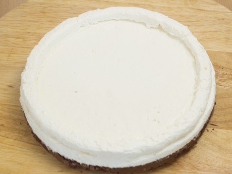 11. Étendre une fine couche de crème fouetté sur le gâteau (c’est ce qu’on appelle la “crumb coat”). Mettre au réfrigérateur pendant 15 minutes. Étendre uniformément le reste de la crème fouettée sur le dessus et les côtés. Réserver un peu de crème fouettée pour décorer le dessus du gâteau.