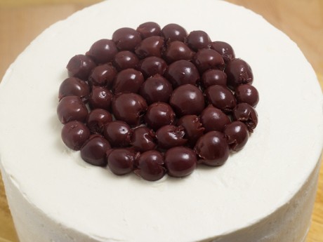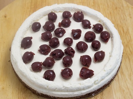 9. En partant du centre, appliquer la crème fouettée en faisant une spirale. Lisser à l’aide d’une spatule à glacer. Appliquer un anneau de crème fouettée supplémentaire à la limite du gâteau afin que les cerises ne tombent pas. Ajouter quelques cerises à l’intérieur de l’anneau.