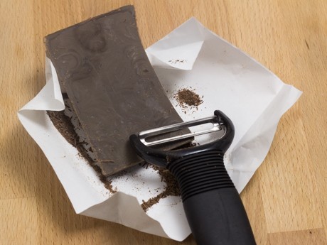 12. Mettre les cerises au centre du gâteau. Faire des points ou des rosettes à l’aide de la crème fouettée restante. Faire des copeaux de chocolat à l’aide d’un économe et déposer à l’aide d’une cuillère entre les cerises et la crème fouettée. Laisser durcir au réfrigérateur au moins 30 minutes ou préférablement plusieurs heures afin que les saveurs se développent et que la crème fouettée fige.