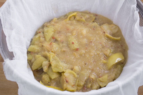 Filtrer la préparation à l’aide d’un tamis recouvert de coton fromage. Presser pour recueillir le plus de saveur possible des pommes. Pour une gelée très claire, laisser égoutter pendant plusieurs heures ou toute la nuit.