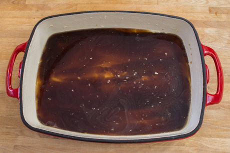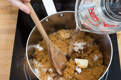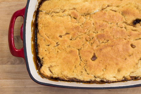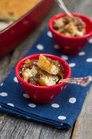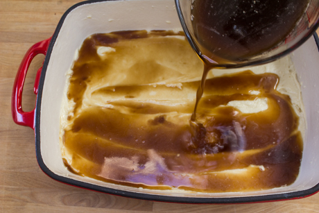 Retirer le sirop du feu et versez doucement sur la pâte à gâteau pour le couvrir entièrement. Le sirop va couler au fond de la casserole pendant que le pouding cuit, créant une sauce riche et délicieuse.