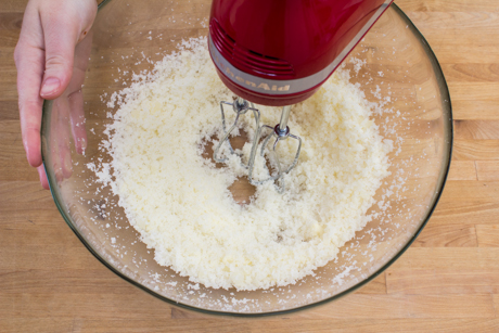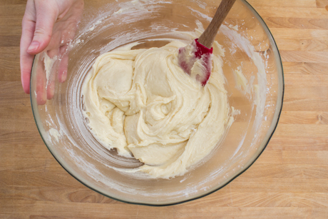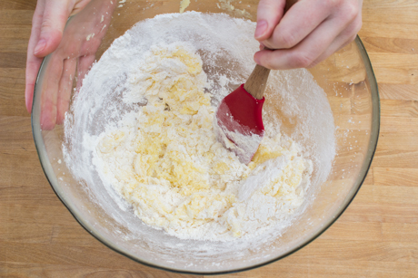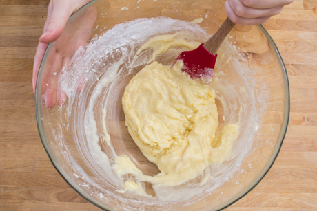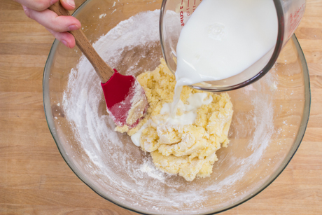 Mélanger en alternance les ingrédients secs et le lait dans le mélange de sucre, en commençant et en terminant avec les ingrédients secs, jusqu’à ce que tout a été incorporé et que la pâte soit lisse.