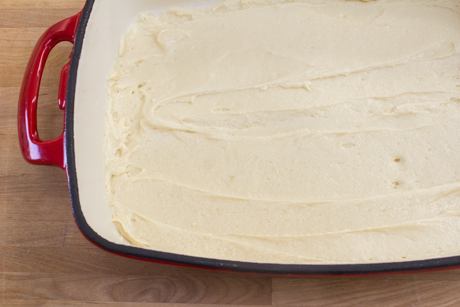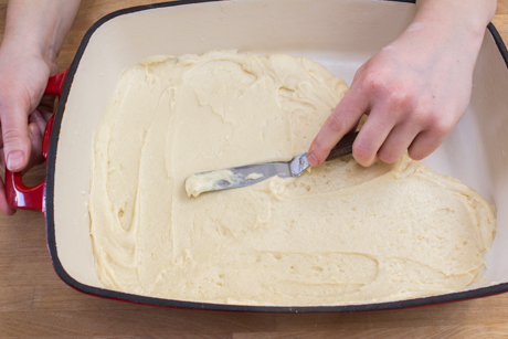 Verser la pâte dans le moule préparé et étendre uniformément avec un couteau ou une spatule à pâtisserie. Mettre de côté.
