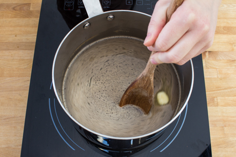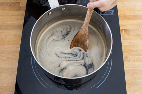 Mélanger le sucre avec l’eau, le lait ou la crème (ou un mélange des deux ou des trois ingrédients, comme une tasse d’eau + 1 g de crème). Ajouter le beurre et la vanille, puis porter à ébullition et laisser cuire jusqu’à ce que le sucre soit dissous.