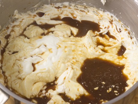 1. Fouetter la crème dans un gros bol jusqu’à la formation de pics mous. Ajouter la Cassonade Foncée Redpath® et 3 c. à table d’expresso ou de café froid, le yogourt grec et l’extrait de vanille.