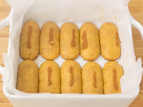 3. Verser l’expresso ou le café froid restant dans un plat peu profond et tremper chaque doigt de dame dans le sens de la longueur. Ne pas les submerger au complet, car ils deviendront trop mous. Déposer les doigts de dame dans le moule préparé.