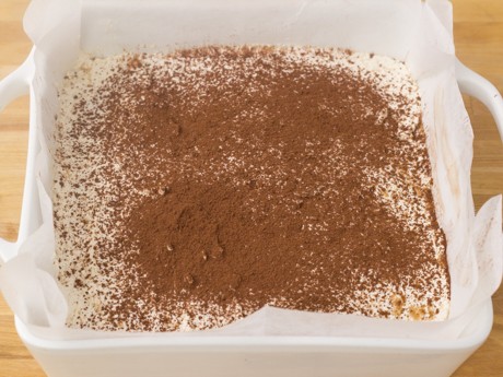 4. Déposer ⅓ du mélange de crème par-dessus les doigts de dame, étendre uniformément et saupoudrer de poudre de cacao. Répéter l’opération en ajoutant une autre couche de doigts de dame et de crème et étendre uniformément. Couvrir d’une pellicule de plastique et mettre au congélateur pendant trois heures.